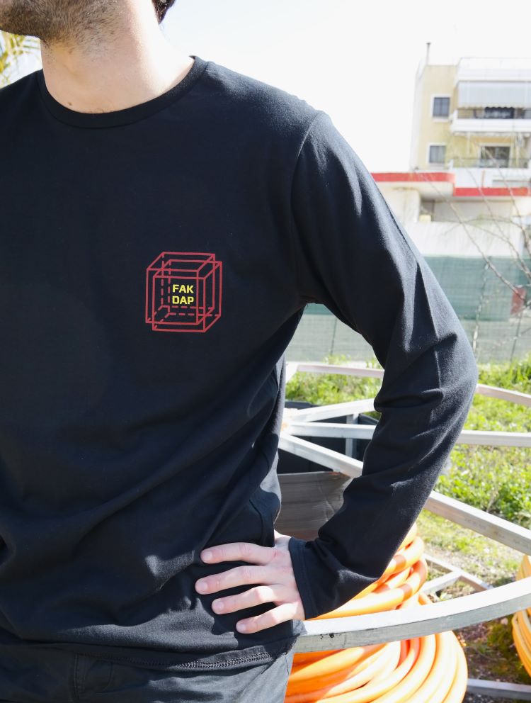 Our FakDap Square Cube Black Tee Is A Long Sleeve Crewneck T-shirt Made From Soft Cotton And Features A Mini Cube With Our Logo On The Front And Four Big Ones On Square On The Back.